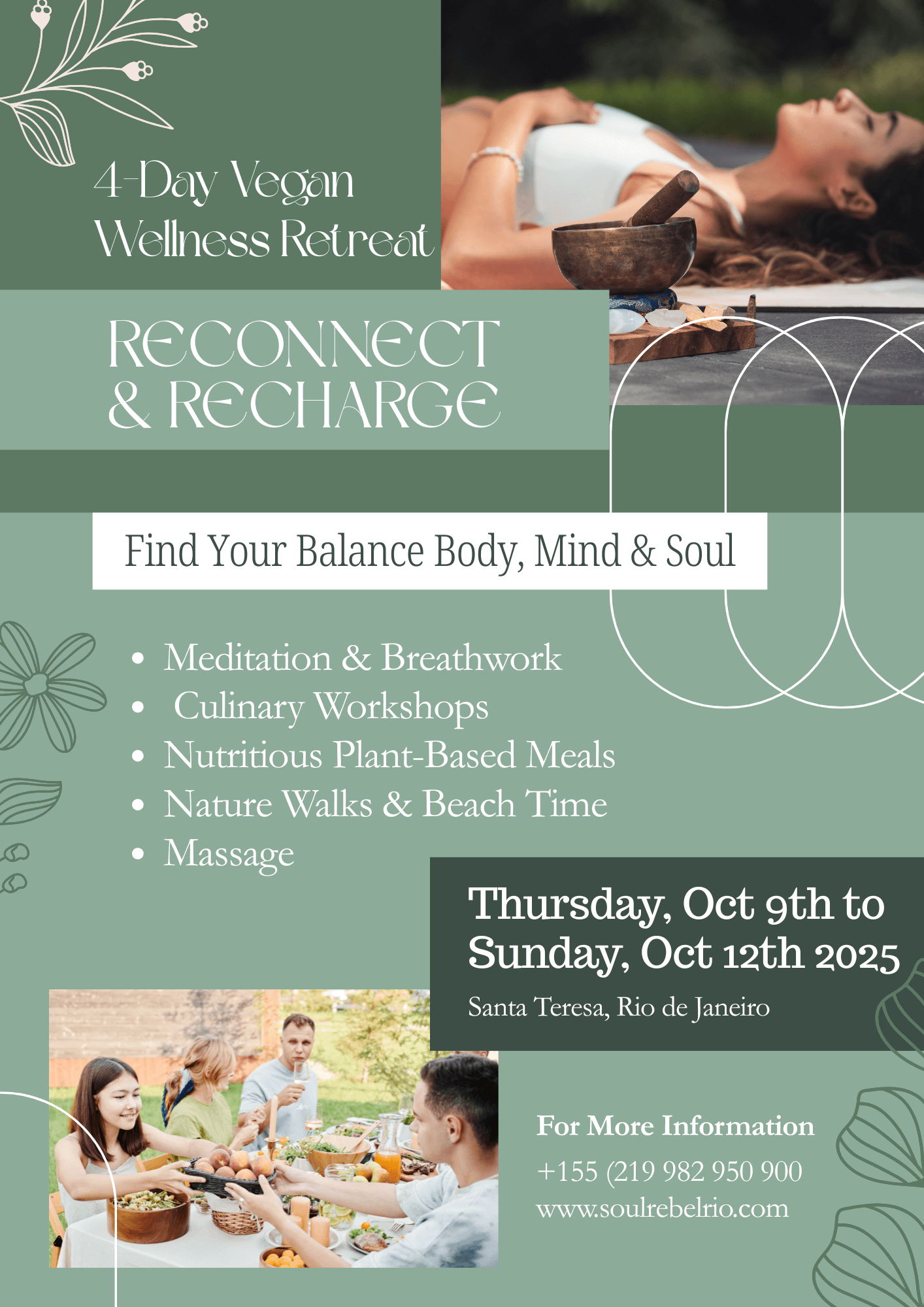 Nourish your body, calm your mind, and reconnect with your inner rhythm. This 4-day retreat offers daily yoga, vibrant plant-based meals, a hands-on vegan cooking class, and deeply relaxing massage — all in the peaceful embrace of Rio’s lush hills. A soulful escape to rest, reset, and realign with what truly matters.
